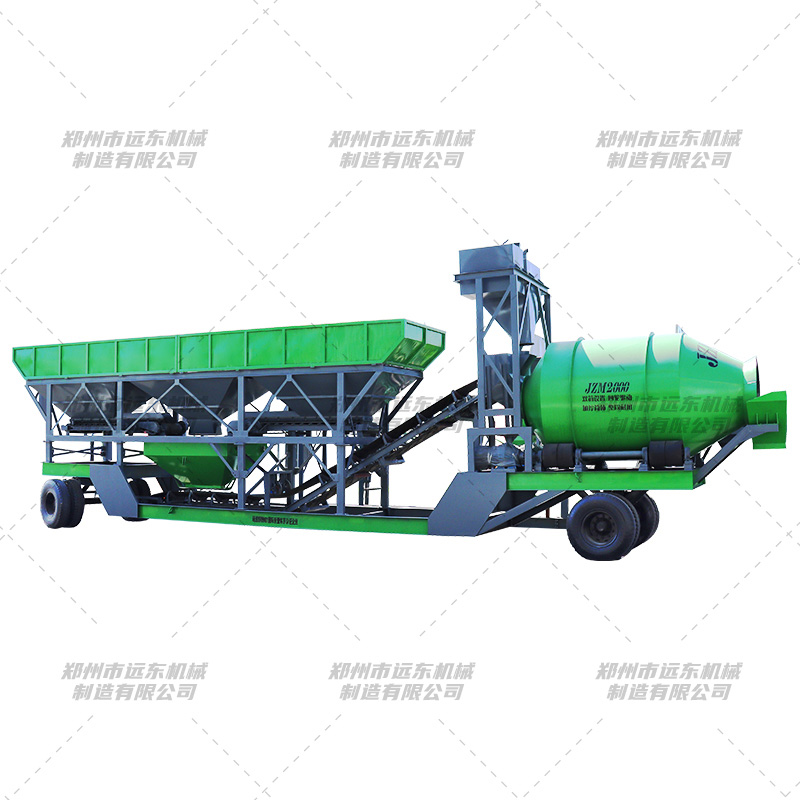 移動攪拌站,是一種可移動的混凝土攪拌站設備。通過設計,把攪拌站的配料系統、稱量系統、攪拌主機、儲料、卸料以及自動控制系統集中在一個拖掛單元,通過拖車實現攪拌站的移動。攪拌主機減速機、計量傳感器、和控制系統的主要電氣元件均采用進口元件,不僅大大地降低了設備的故障率,而且提高了設備的計量精度。整機采用計算機控制,既可自動也可手動操作,操作簡單,易于掌握。動態面板顯示,能清楚了解各部件的運行情況,同時可以存儲、打印報表資料,為生產調度管理提供了方便。 1、滾筒移動攪拌站外部設有骨料配料裝置及輸送砂、石骨料用的皮帶輸送機。 2、骨料儲料上架設皮帶輸送機的機頭和支架,骨料預加料斗(儲存已混合、稱量好的骨料)。它們將按配比稱量好的骨料傳送裝置卸料到混凝土攪拌機內。 3、攪拌機平臺上裝有臺滾筒攪拌機,在其上部是計量裝置,按配比分別稱量水泥、水、塑化劑等的用量,待稱量完畢后,卸入攪拌機內,連同稱量好的骨料進行攪拌,攪拌均勻的混凝土可以卸料到混凝土運輸車中運走。